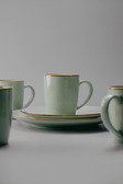 Комплект посуды из 12 предметов из фарфора серо-зеленого цвета с коричневым искусственно состаренным кантом. В наборе: обеденные тарелки (d 27 см) - 4 шт., десертные тарелки (d 22 см) - 4 шт., кружки (350 мл) - 4 шт.
