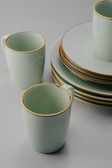 Комплект посуды из 18 предметов из фарфора серо-зеленого цвета с коричневым искусственно состаренным кантом. В наборе: обеденные тарелки (d 27 см) - 6 шт., десертные тарелки (d 22 см) - 6 шт., кружки (350 мл) - 6 шт.