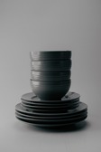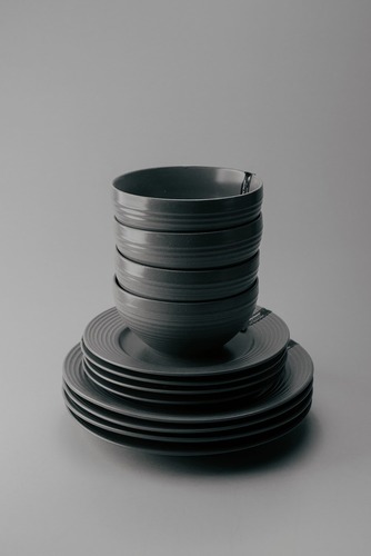 Комплект посуды из 18 предметов из фарфора темно-серого цвета с рельефным кантом. В наборе: обеденные тарелки (d 27 см) - 6 шт., десертные тарелки (d 22 см) - 6 шт., супницы (d 15 см) - 6 шт.
