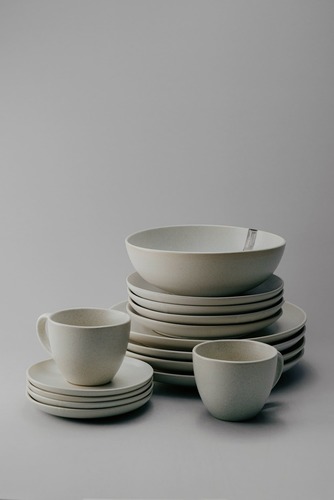 Комплект посуды из 25 предметов из фарфора светло-серого цвета с вкраплениями. В наборе: обеденные тарелки (d 27 см) - 6 шт., десертные тарелки (d 20 см) - 6 шт., чашки (220 мл) - 6 шт., блюдца (d 15 см) - 6 шт., салатница (d 20 см) - 1 шт.