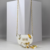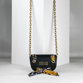 Сумка через плечо от легендарного итальянского бренда VERSACE в трендовой форме полумесяца представлена в черном цвете из материала под сафьяновое покрытие. Размер мини предусматривает, что в эту модельку может поместиться исключительно то, что Вам действительно необходимо. Украшением этой серии аксессуаров является платок в золотистом исполнении, окутывающий изделие с примечательно известными символами бренда.